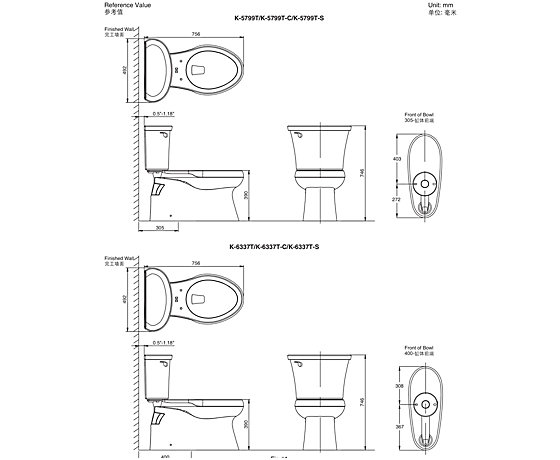 K-5799T-0、K-6337T-0配座便器蓋板K-4653T;K-5799T-C-0、K-6337T-C-0配K-4713T法弧緩降蓋板