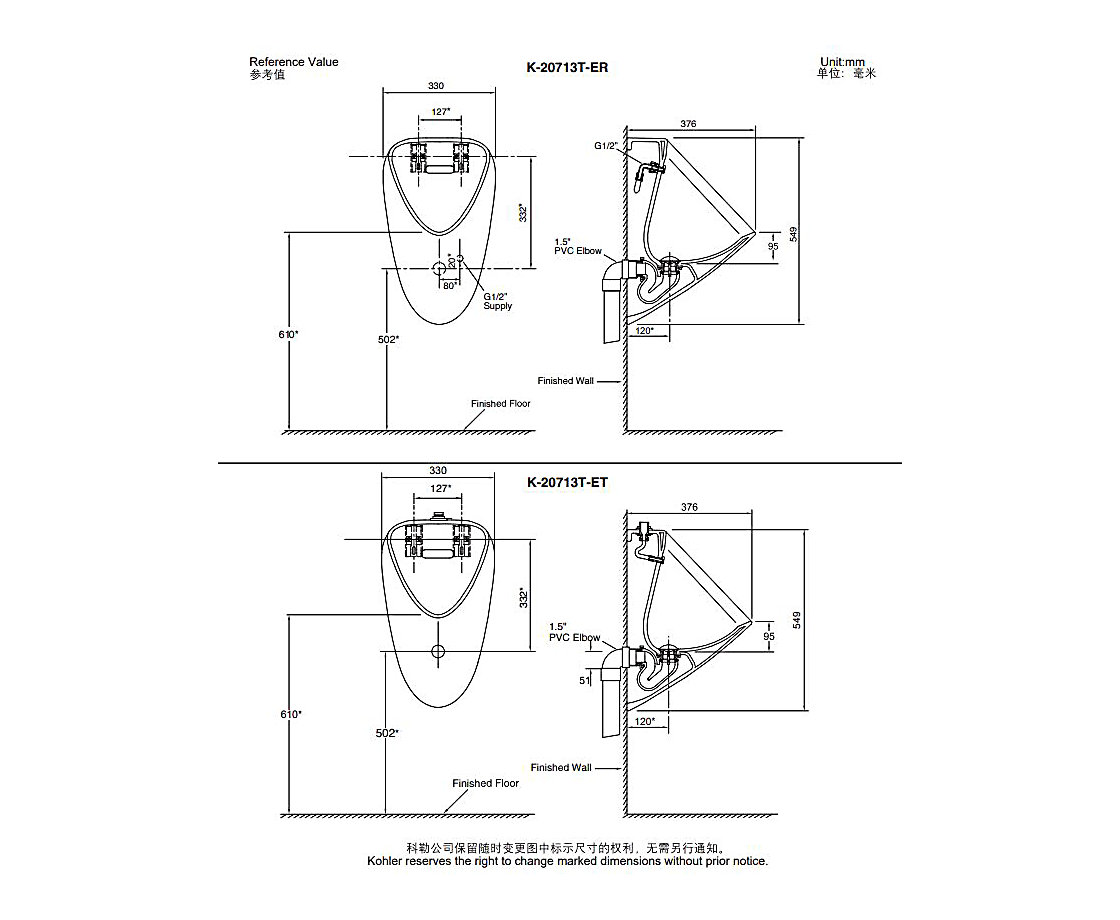 上進水款搭配感應器時,需另配 K-2464T-NA 進水配管; 后進水款搭配感應器時,需另購內徑不小于 9mm 的不銹鋼編織軟管
