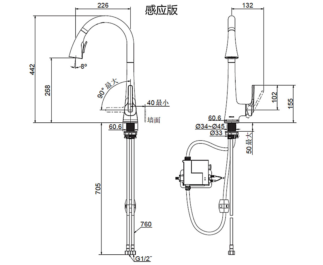 "* 基于國(guó)標(biāo)GB18145-2014 – 7.6.7測(cè)試要求及標(biāo)準(zhǔn) ** 基于國(guó)標(biāo)GB18145-2014 – 7.6.9.1測(cè)試要求及標(biāo)準(zhǔn),結(jié)合科勒實(shí)驗(yàn)室測(cè)試方法推算";若廚下有電源,可另購(gòu)感應(yīng)廚房龍頭電源適配器 - 1431506
